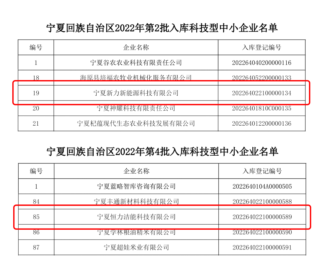 恒力集團喜迎佳音,集團子公司寧夏新力新能源科技有限公司、寧夏恒力潔能科技有限公司經(jīng)寧夏科技廳審核,順利通過認(rèn)定,雙雙成為2022年寧夏回族自治區(qū)庫科技型中小企業(yè)。