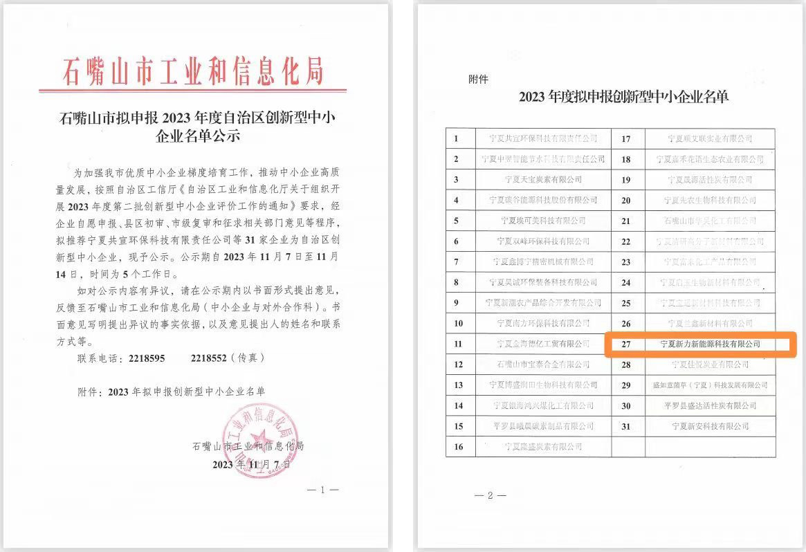 2023年11月7日,石嘴山市工業(yè)和信息化局公布了石嘴山市2023年度自治區(qū)創(chuàng)新型中小企業(yè)名單。經(jīng)過(guò)層層嚴(yán)格遴選,寧夏新力新能源科技有限公司憑借優(yōu)異技術(shù)實(shí)力與創(chuàng)新優(yōu)勢(shì),成功獲得石嘴山市“自治區(qū)創(chuàng)新型中小企業(yè)”認(rèn)定。